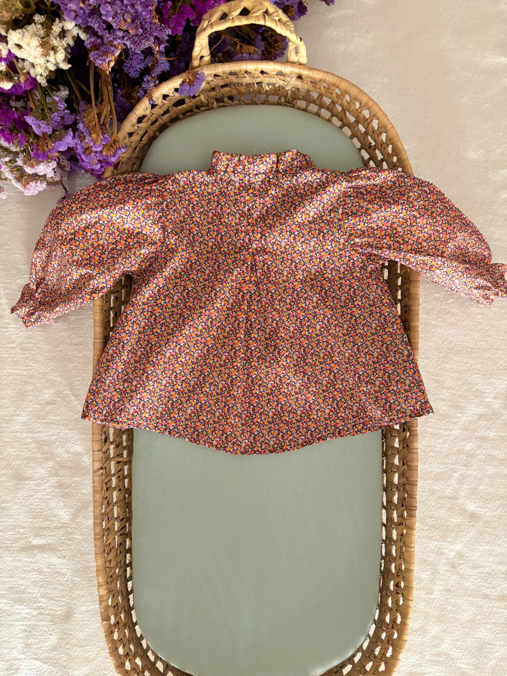 Blusa florida com laços azuis.