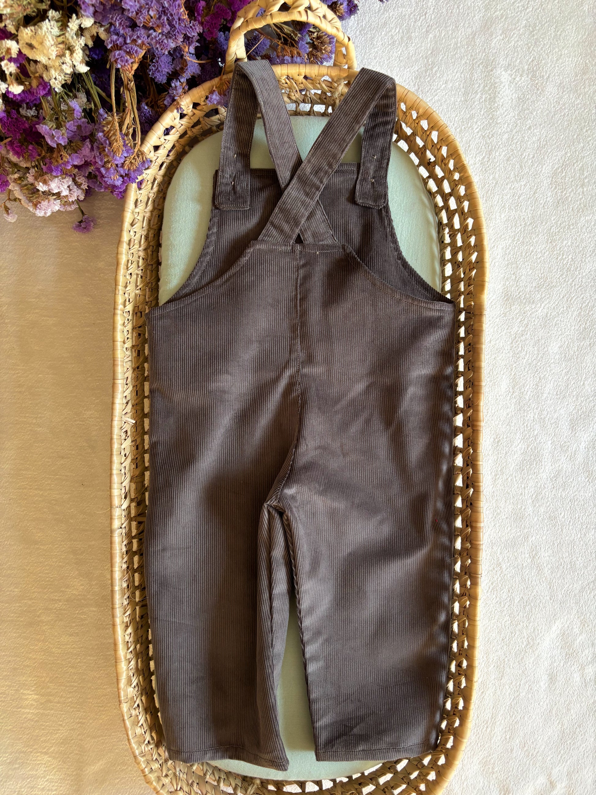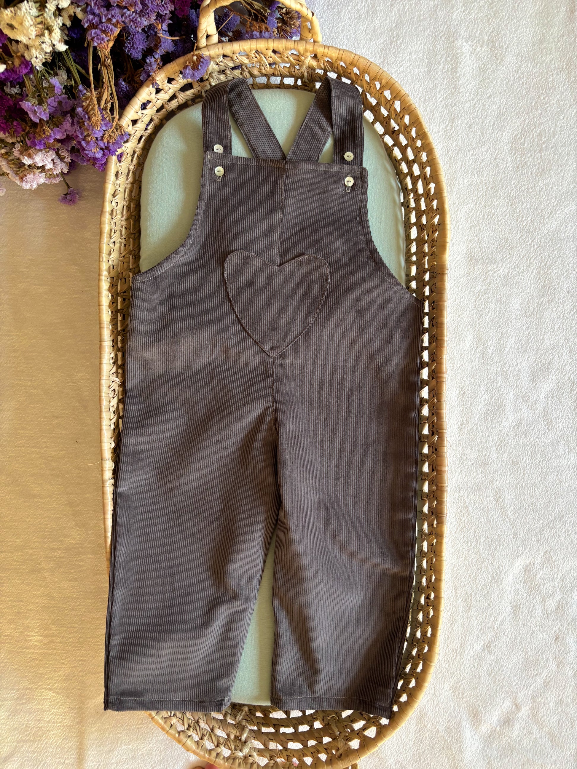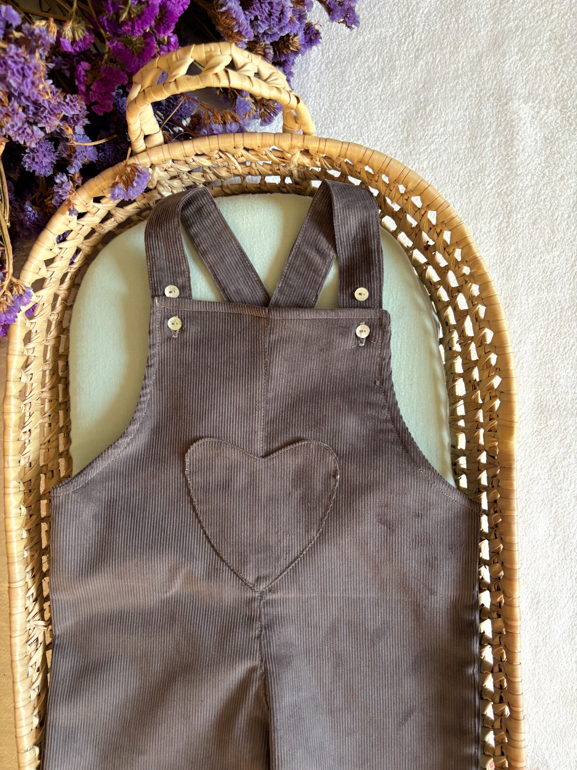 Jardineira em bombazina cinza, com pormenor de bolso coração e 2 botões em madrepérola em cada alça que permite ajustar à evolução da criança. Com molas no entre pernas até ao 18 meses.