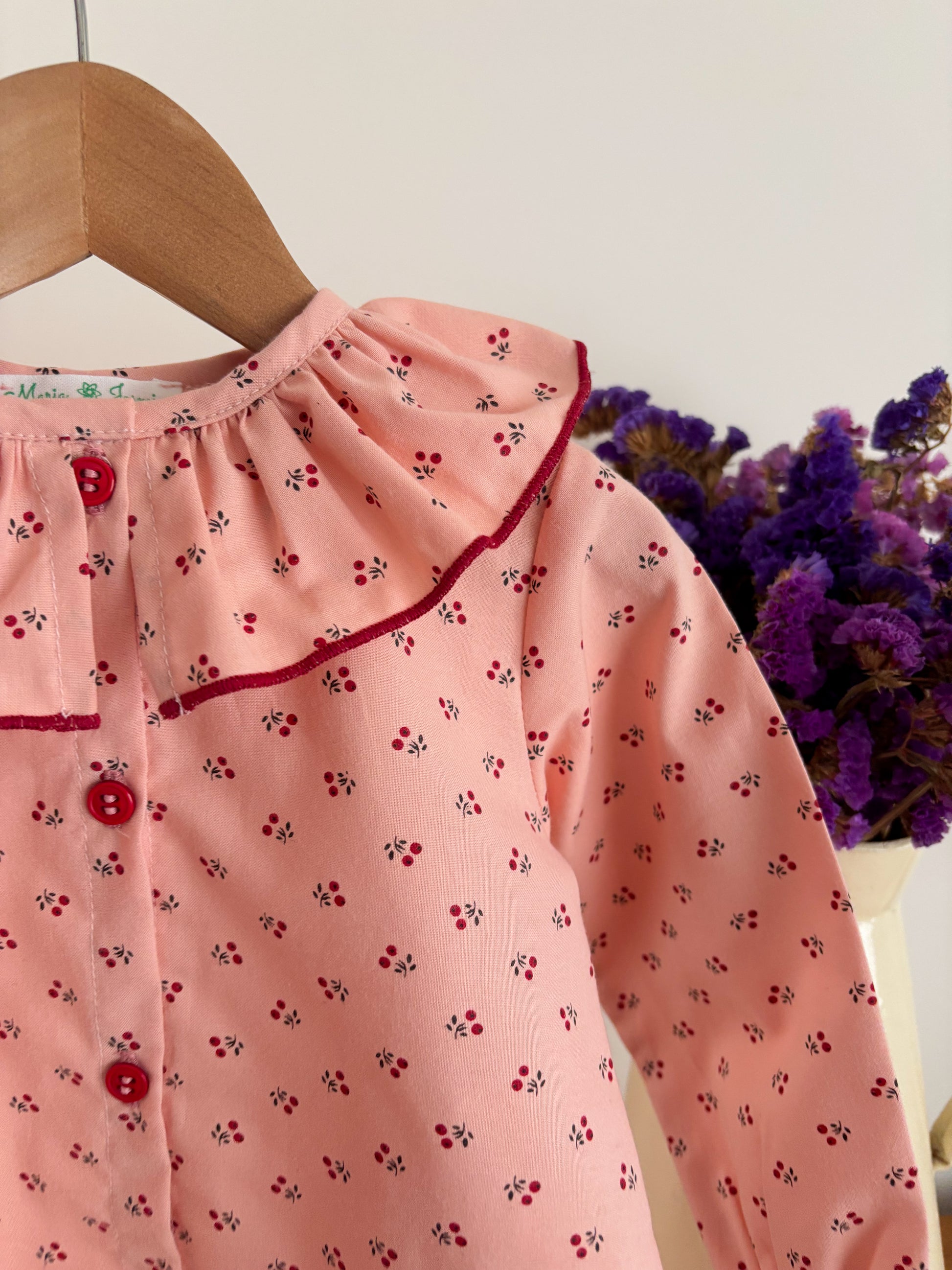 Pijama fundo rosa com motivo cerejas com pormenor de gola volante.