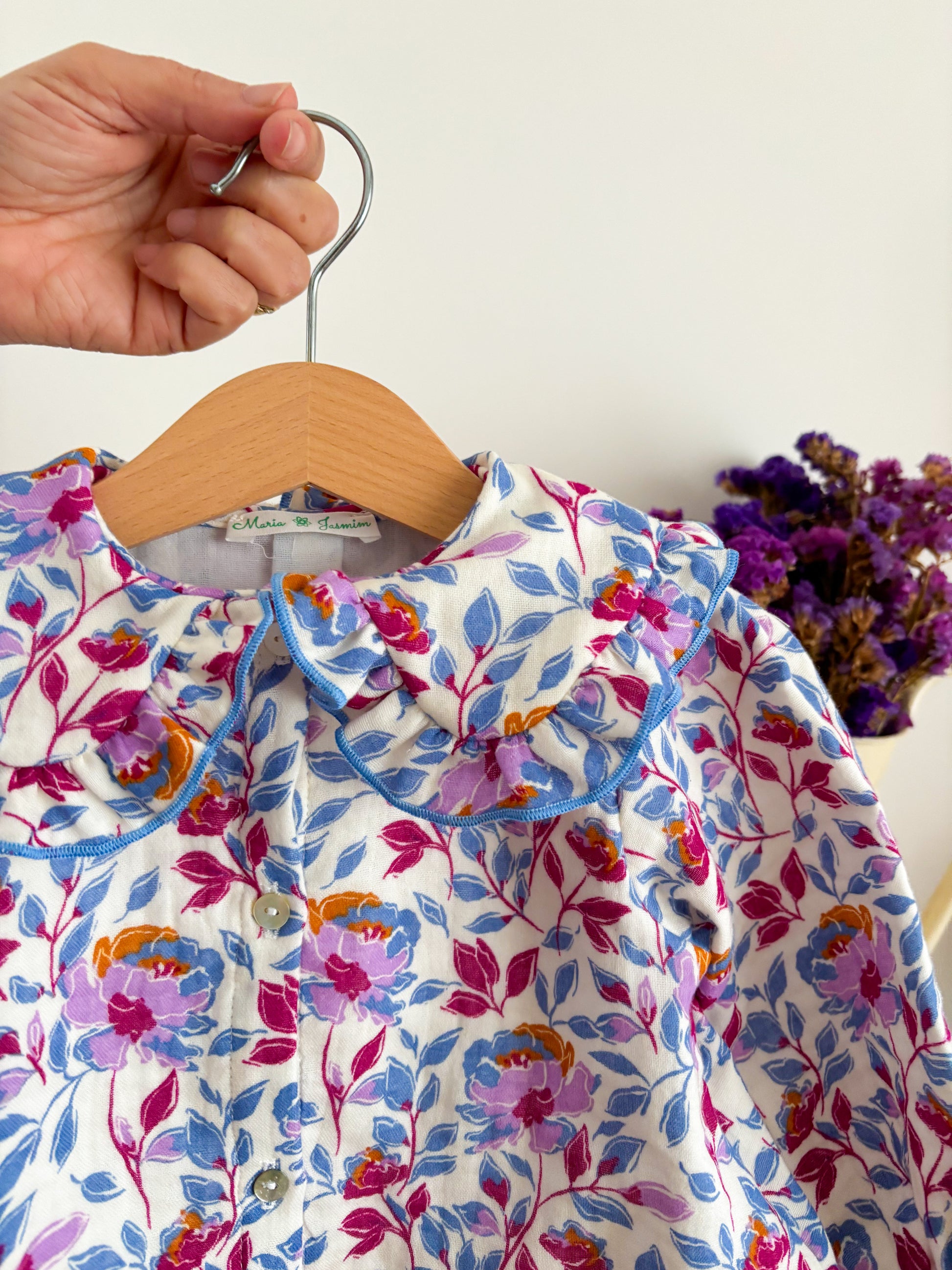 Blusa em tecido musselina azul com padrão florido e gola boneca.