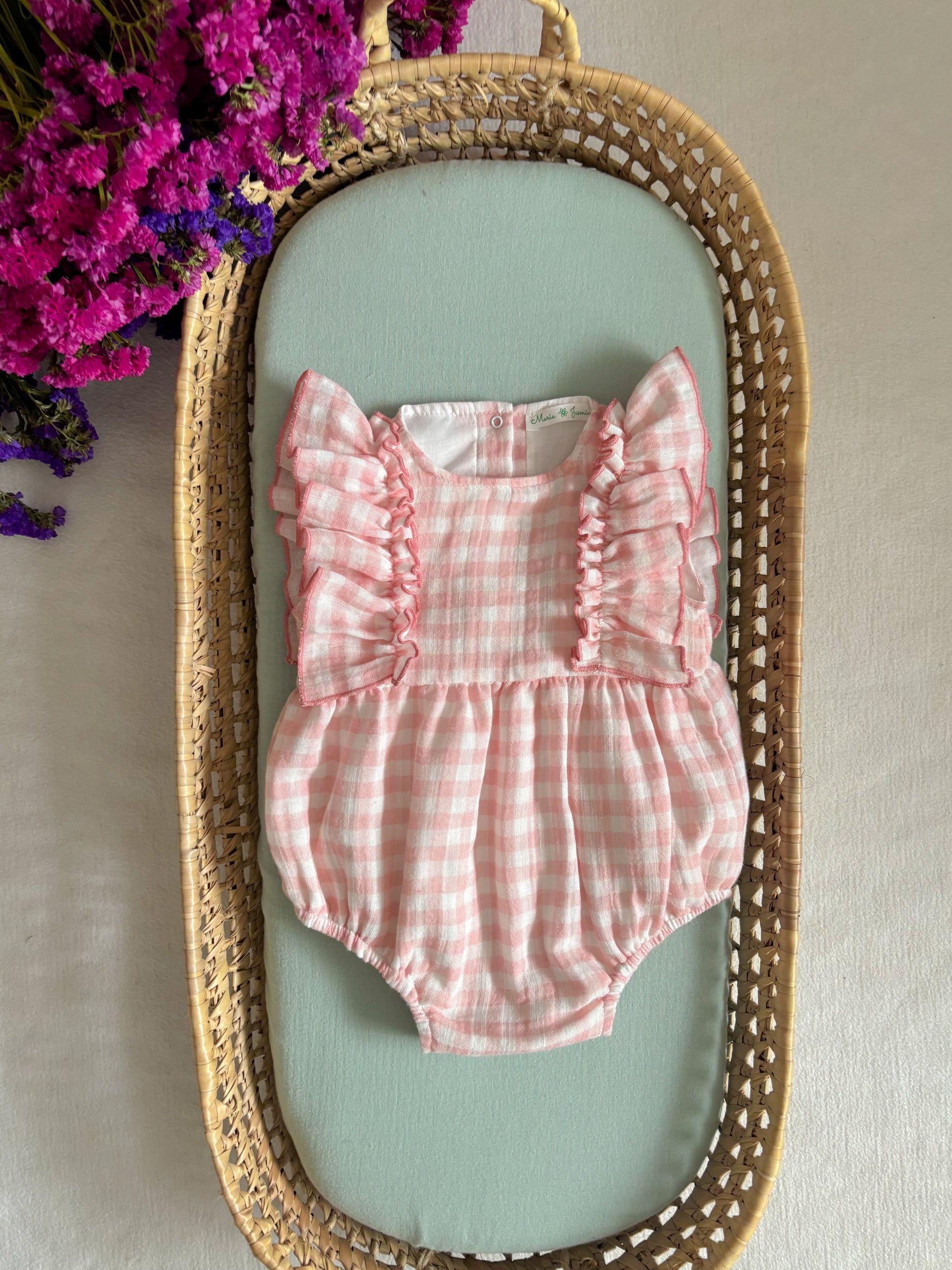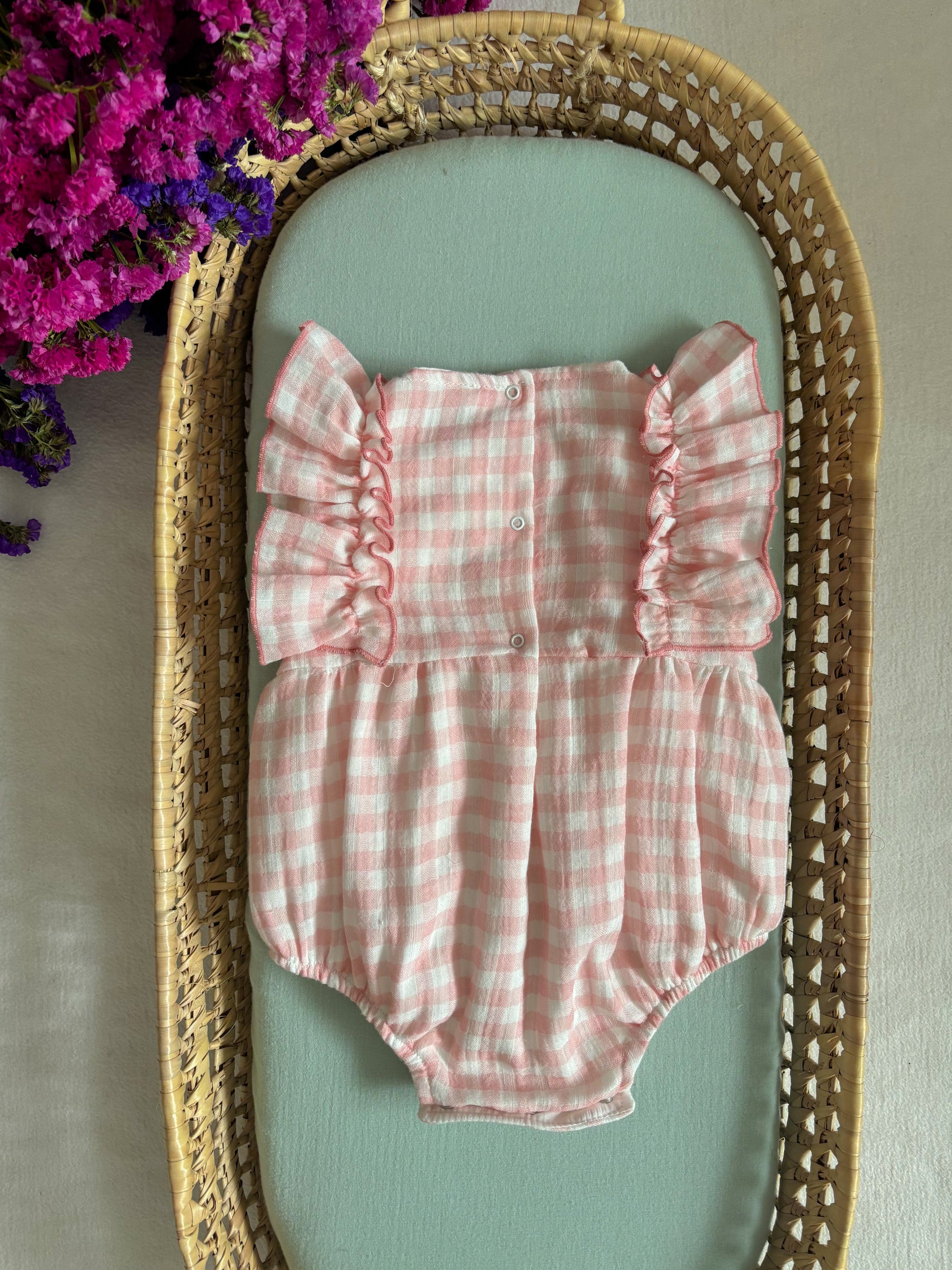 Fofo musselina Vichy Rosa e branco com pormenor de folho.