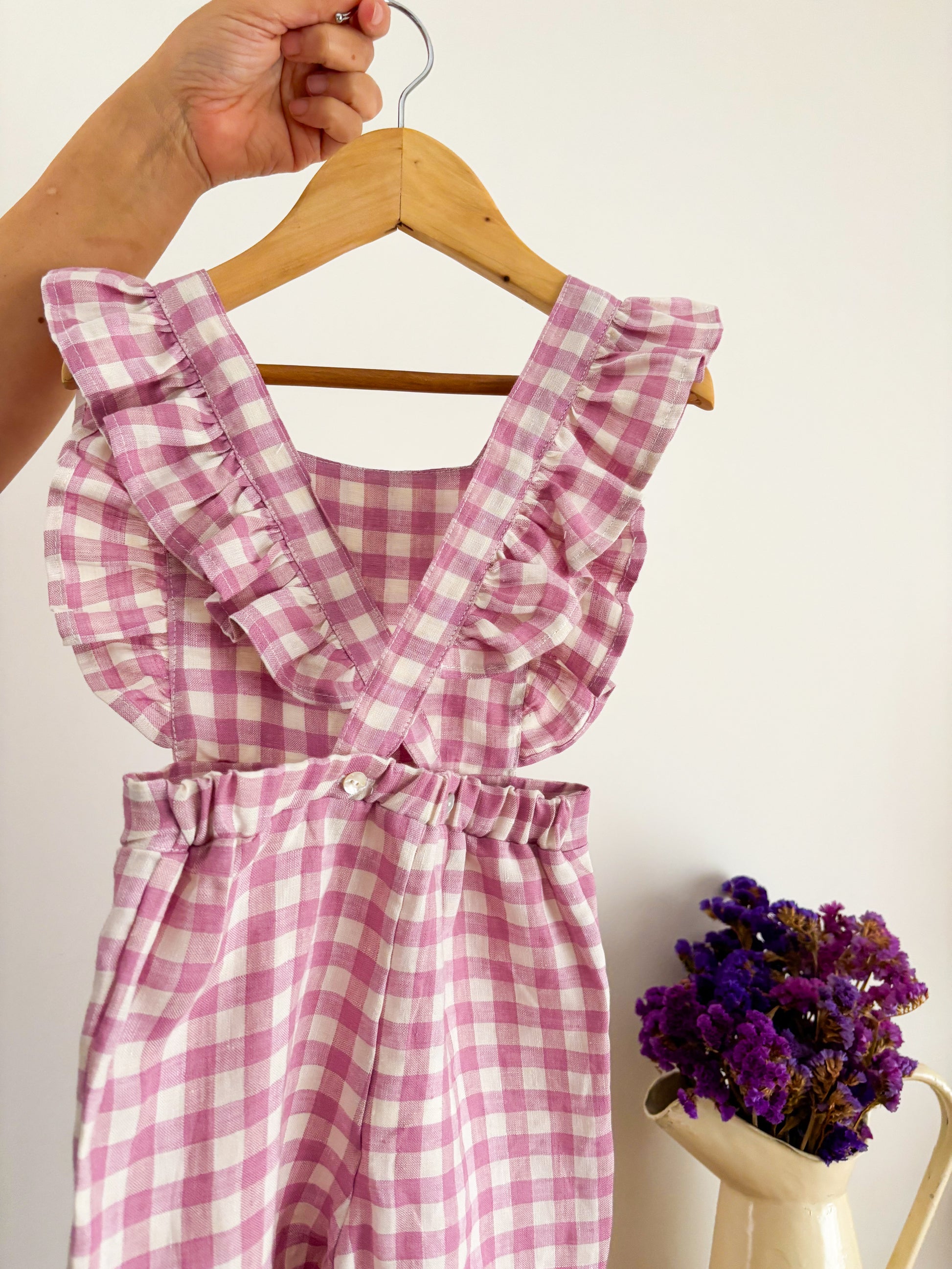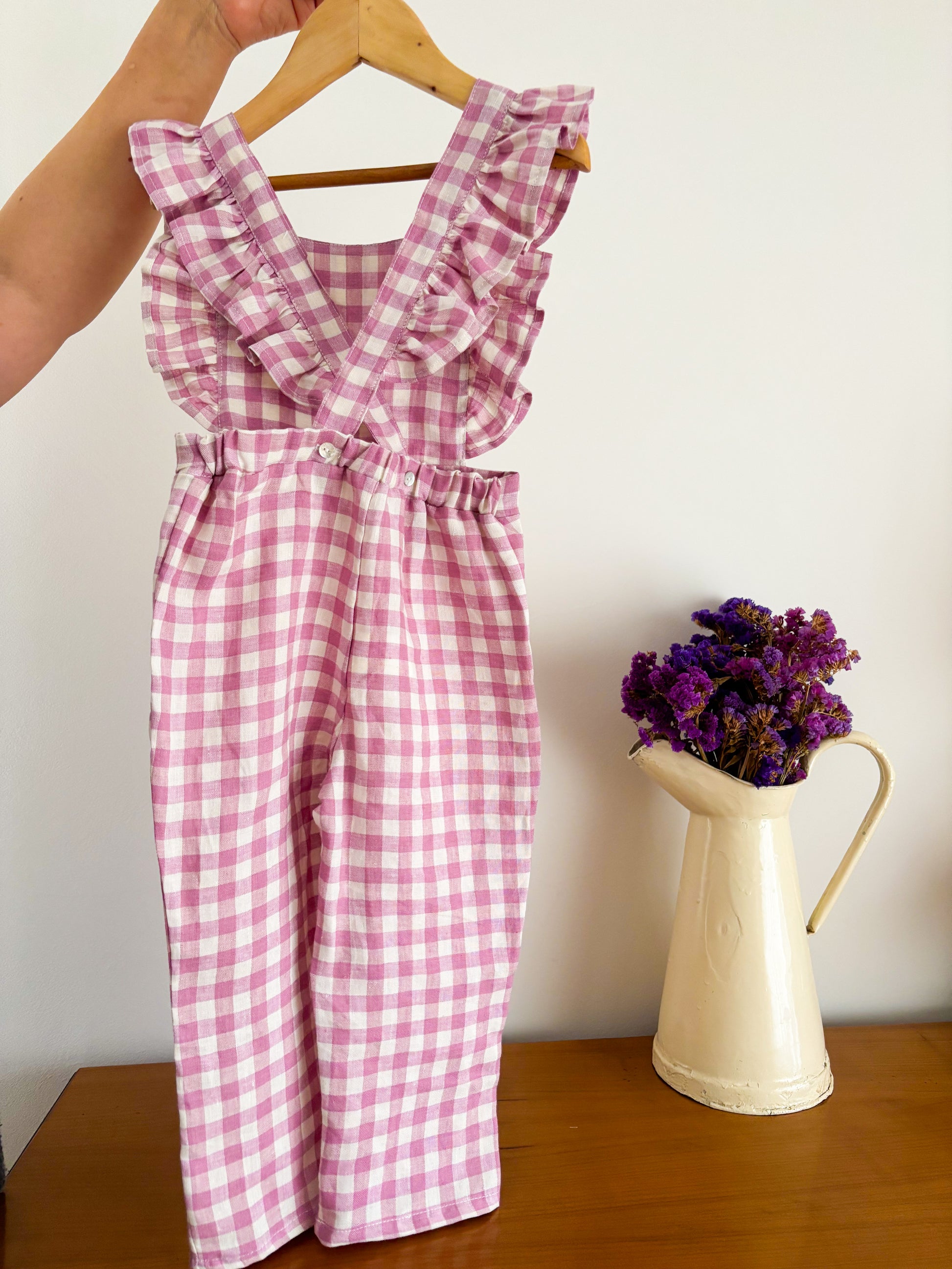 Jardineira vichy rosa pormenor de folho nas alças e peito.