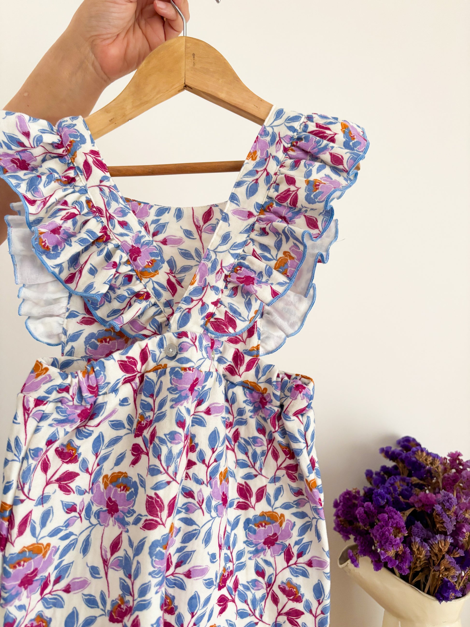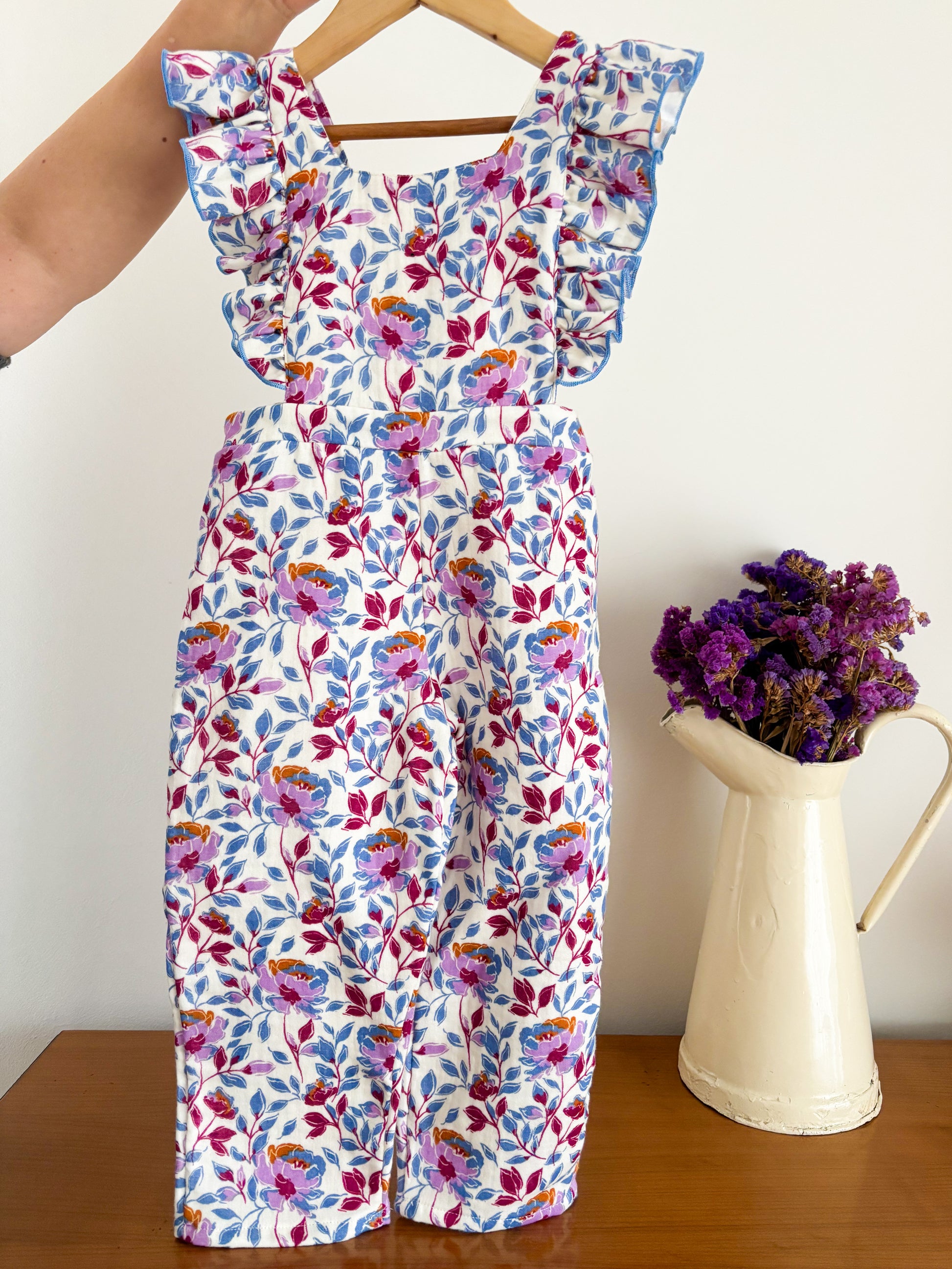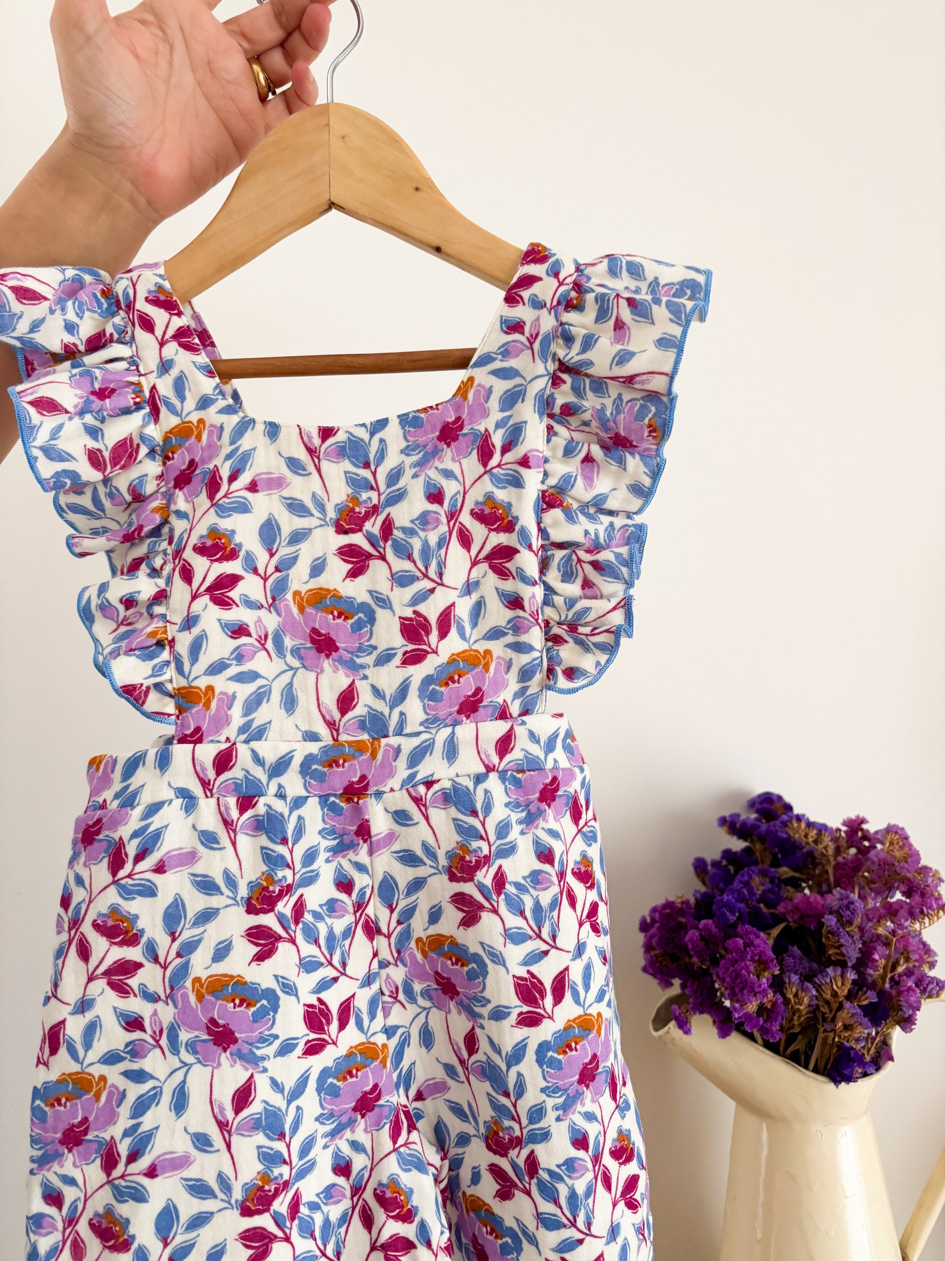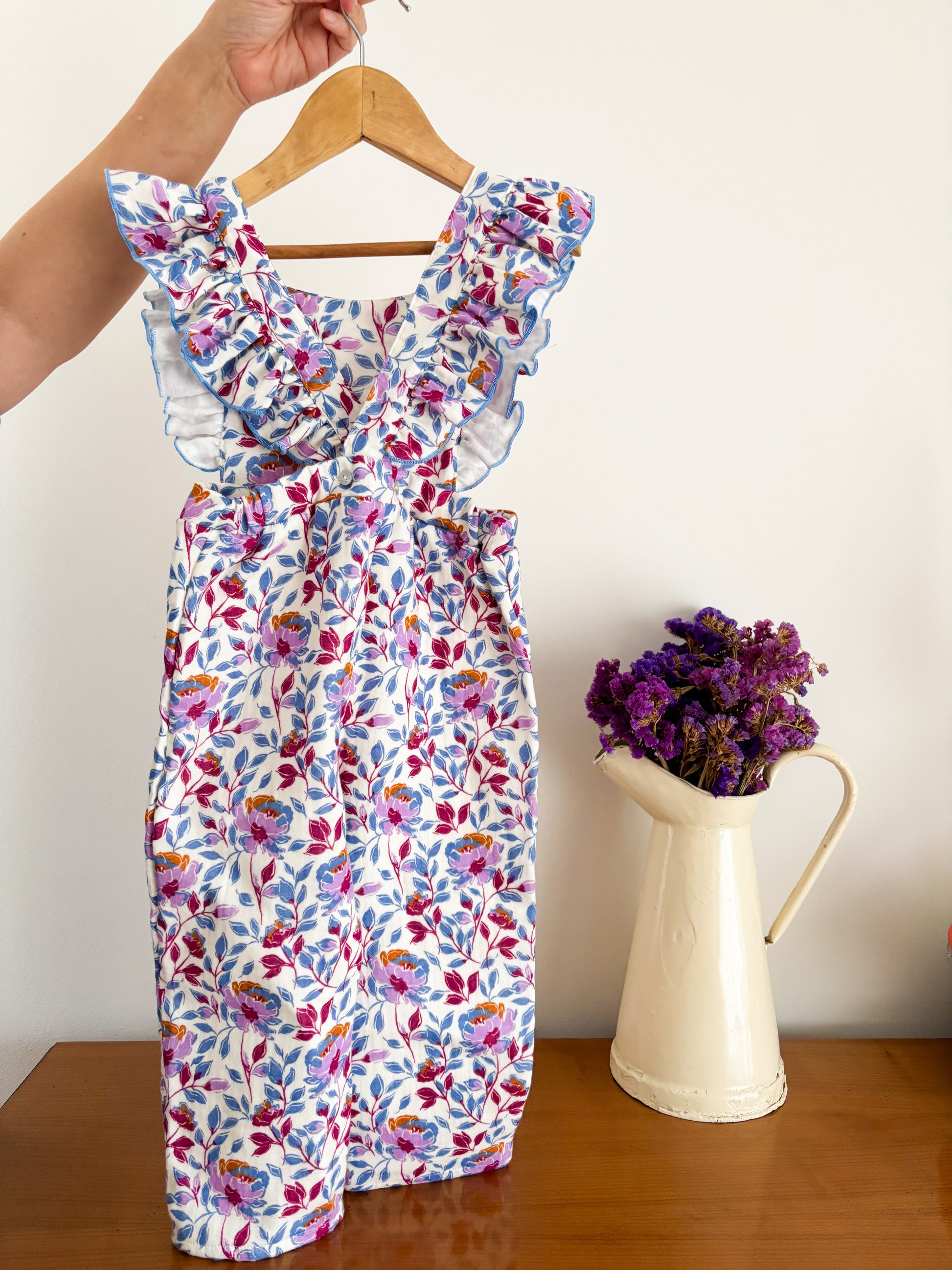 Jardineira musselina florida pormenor de folho nas alças e peito.