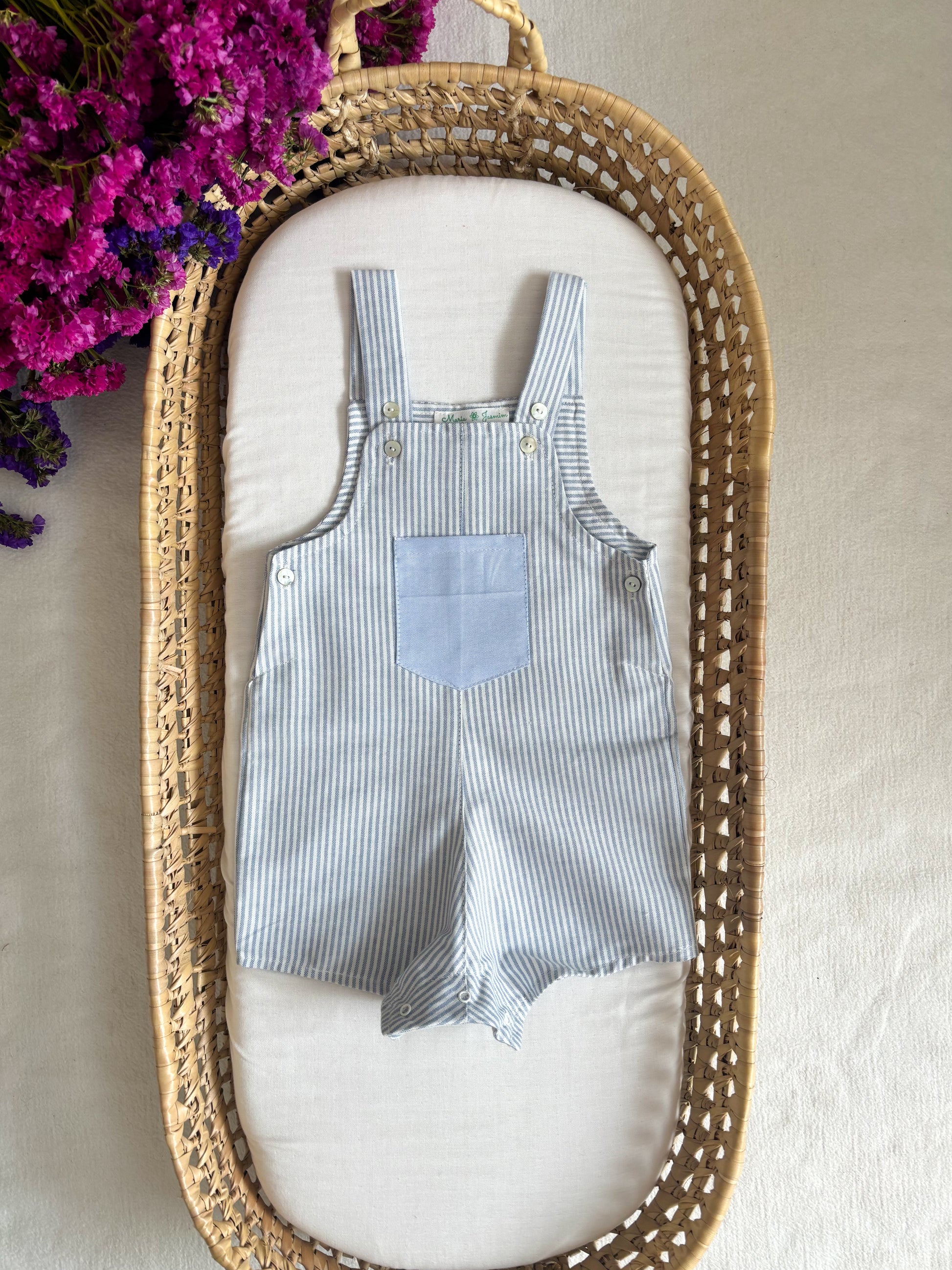Jardineira risca azul e branco com bolso em Oxford azul, super versátil e prática.