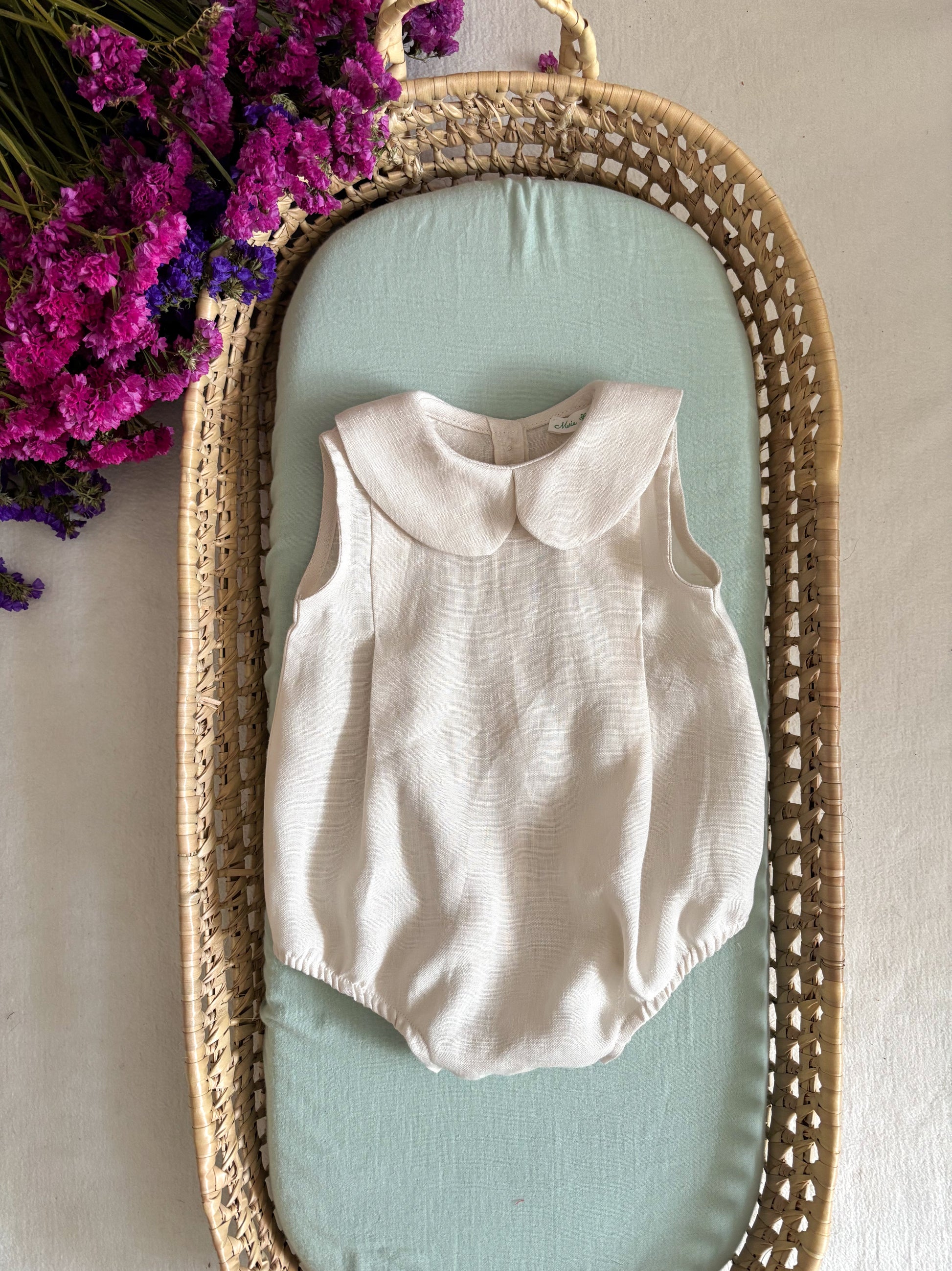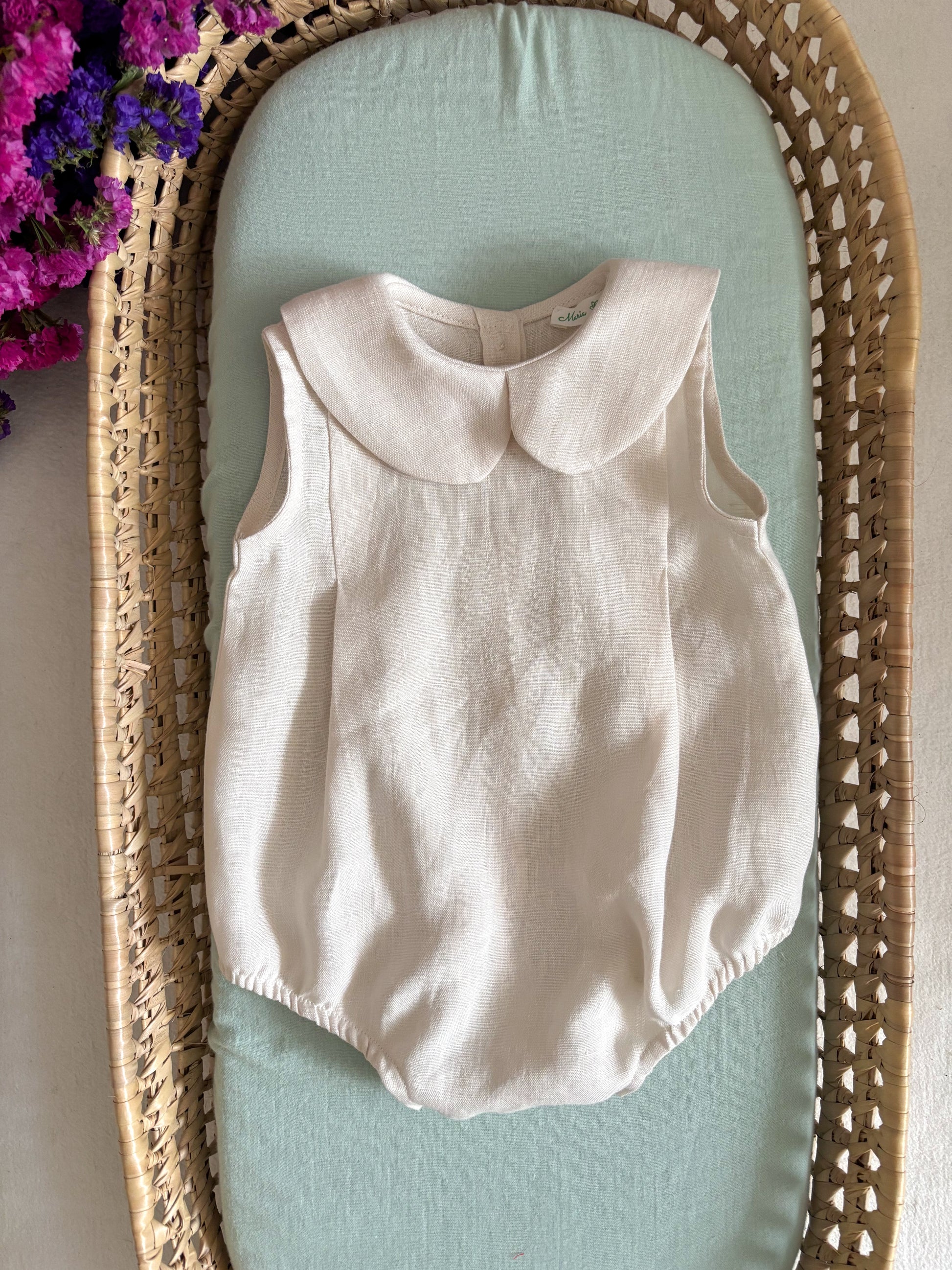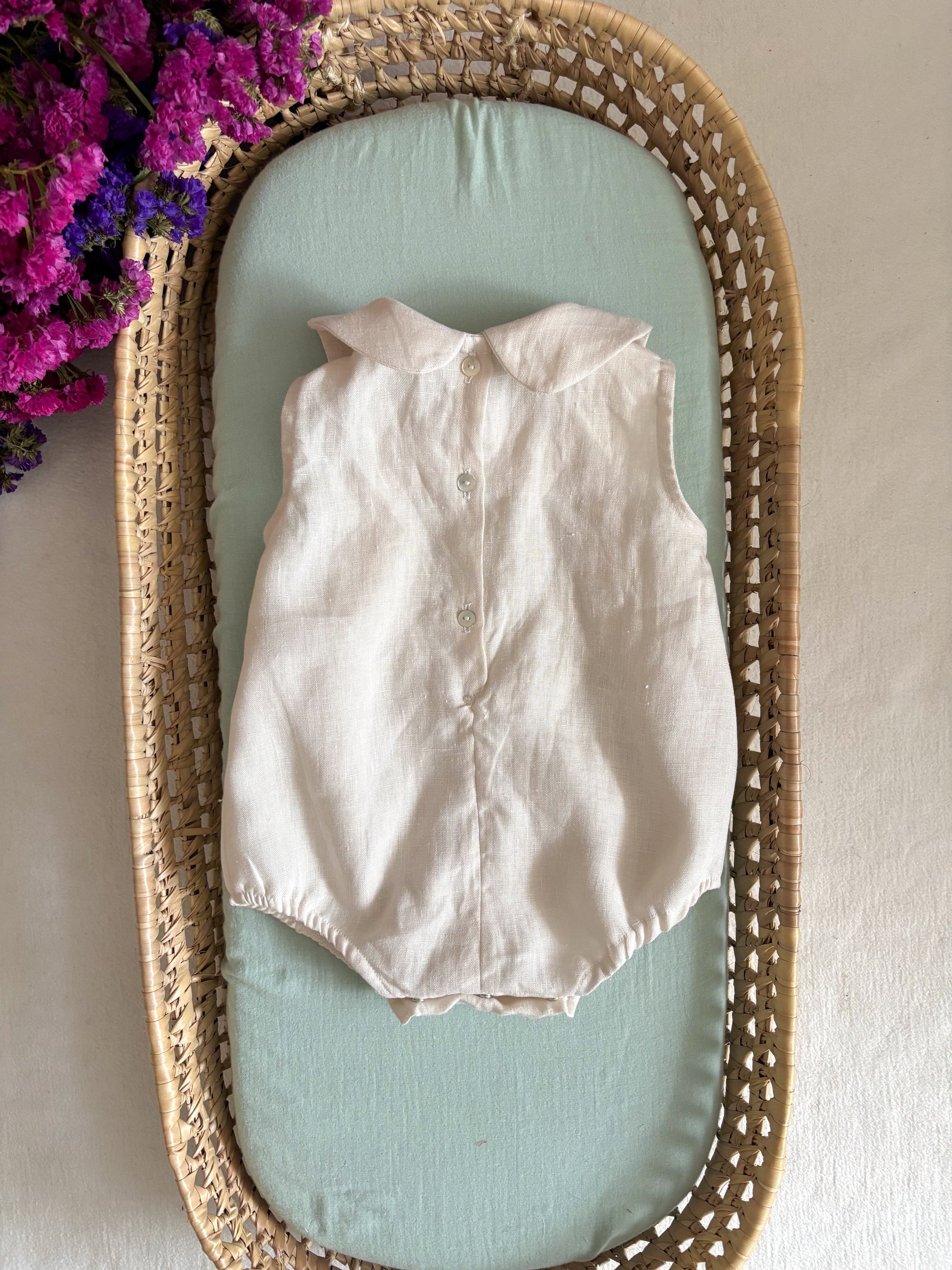 Pelele de bebé de lino color bege con cuello Peter Pan
