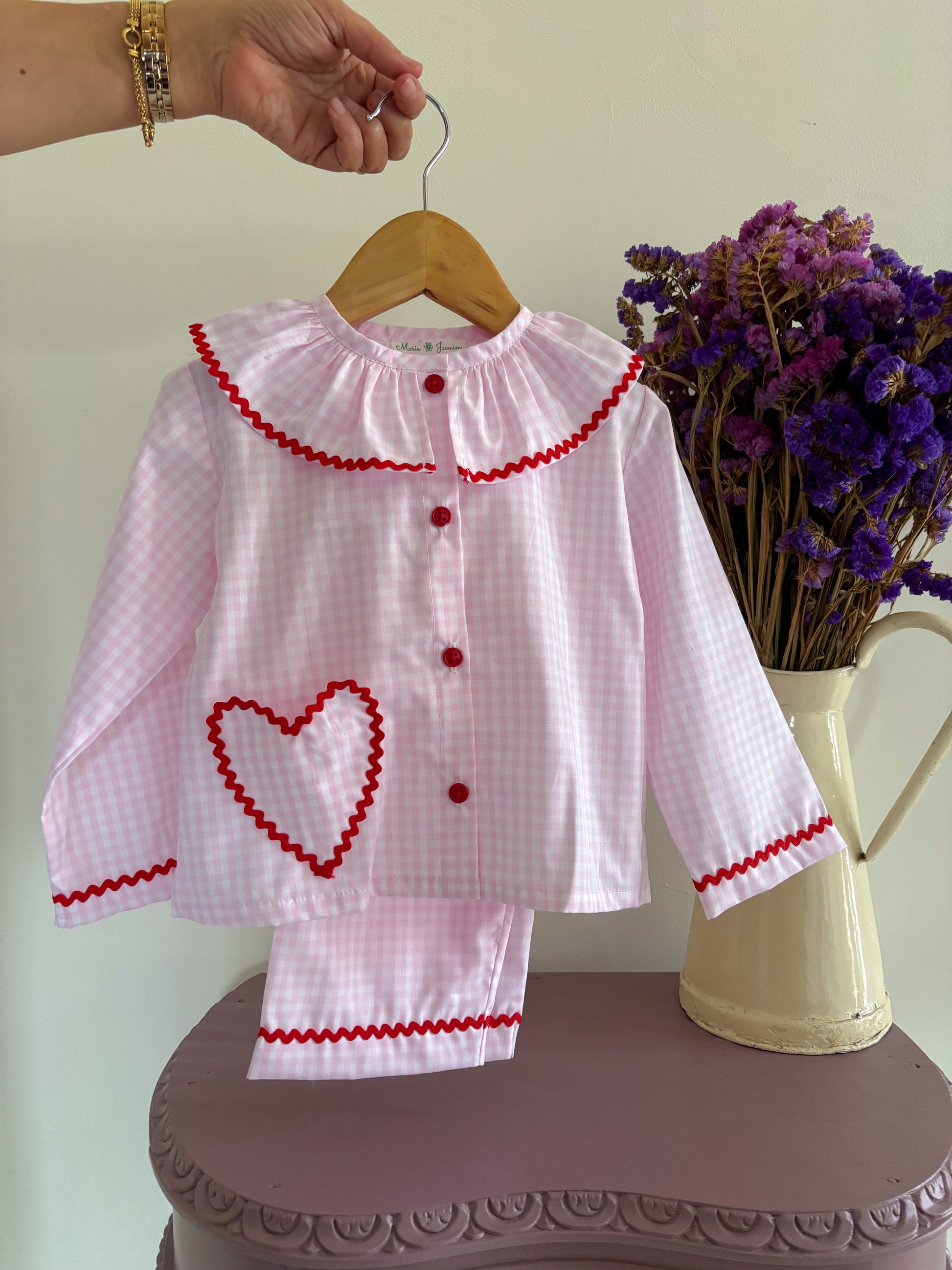 Pijama vichy rosa e branco com pormenor de gola volante e bolso em formato coração com aplicação de espiguilha vermelha.