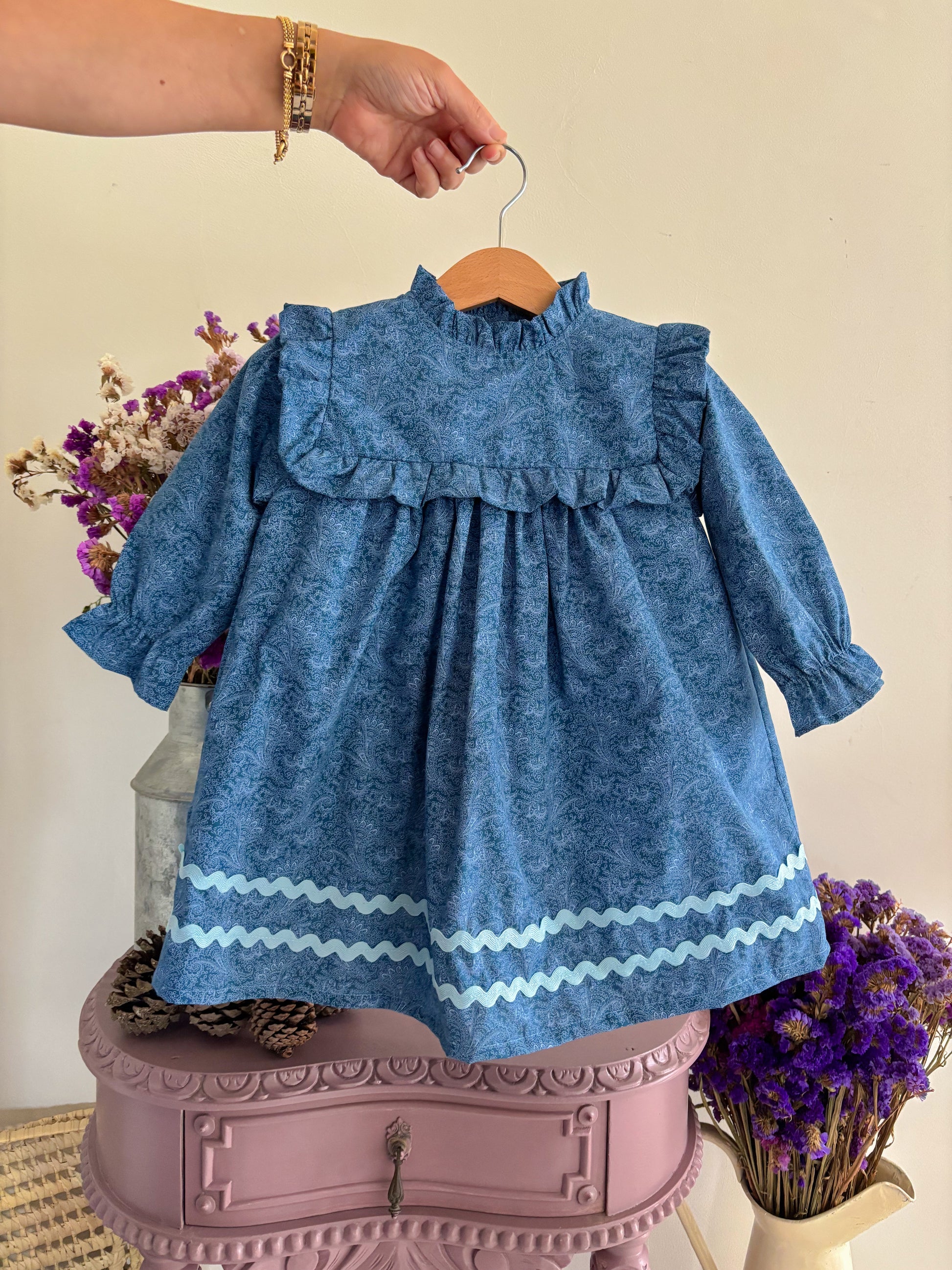 Vestido com cornucópias azul com pormenor de duas faixas de espiguilha.