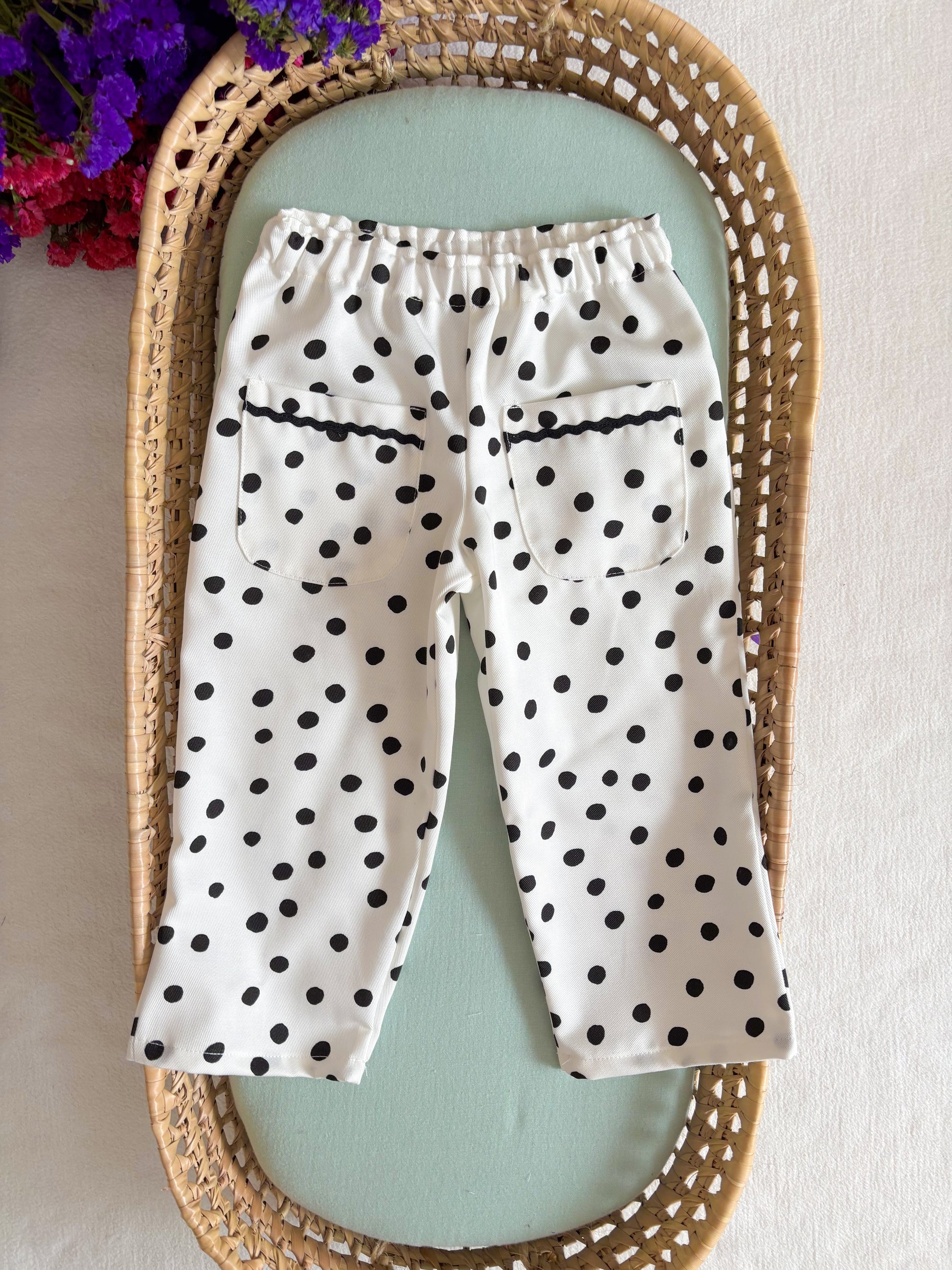 Calça polka dots com pormenor de espiguilha preta.