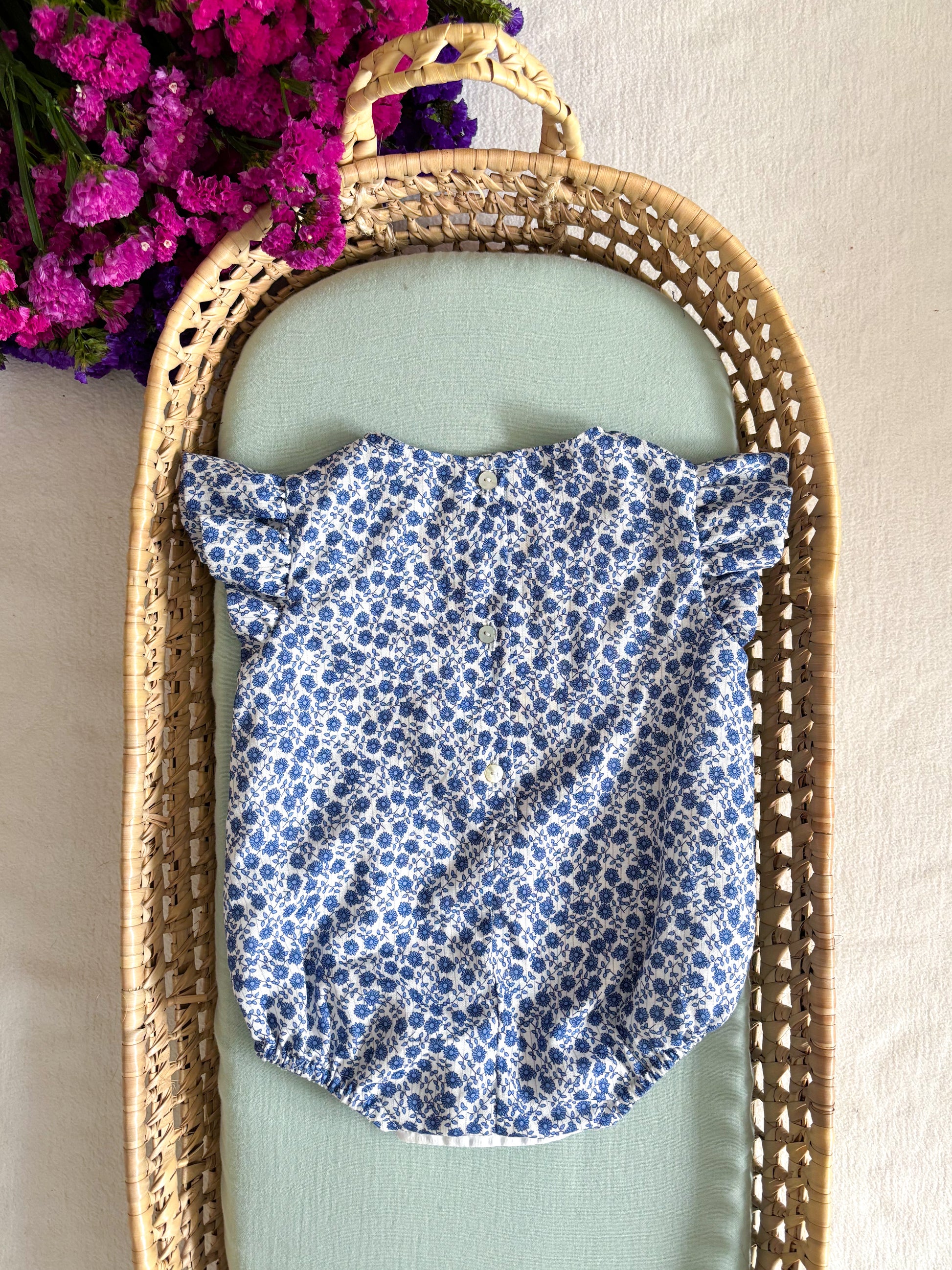 Fofo em linho com motivos floridos e pormenor de manga com folho.