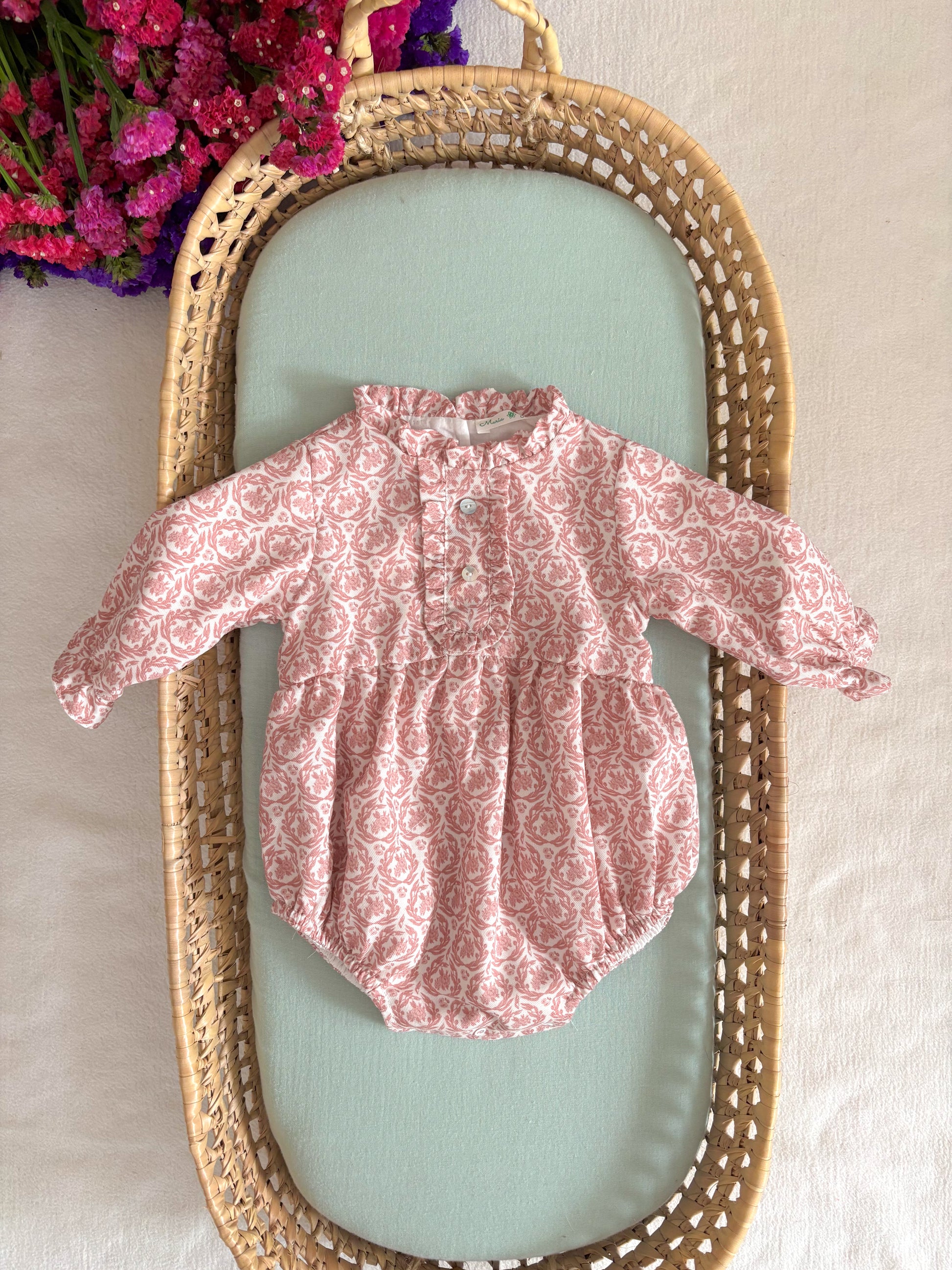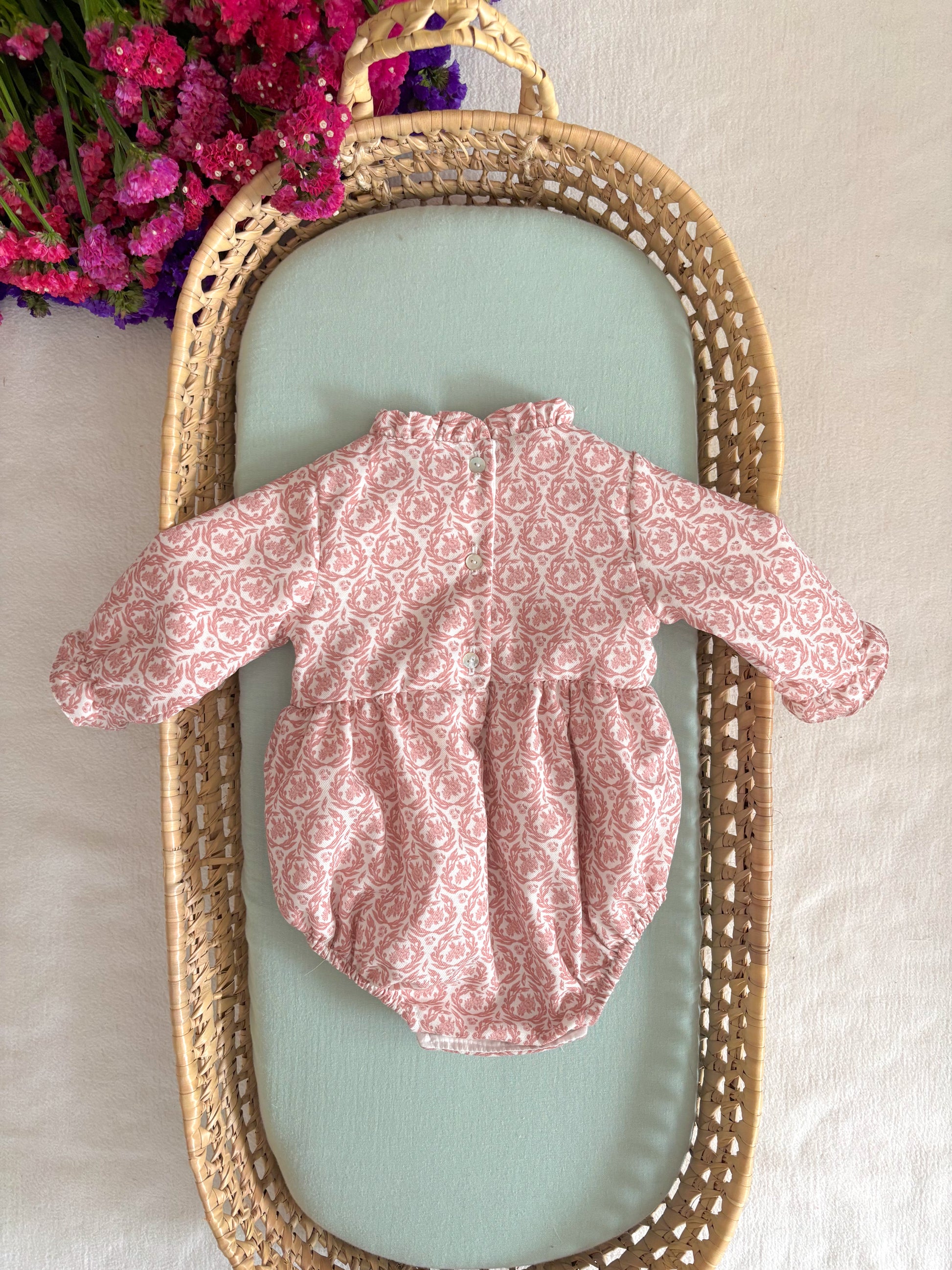 Fofo com motivos floridos e pormenor de folho de manga comprida.