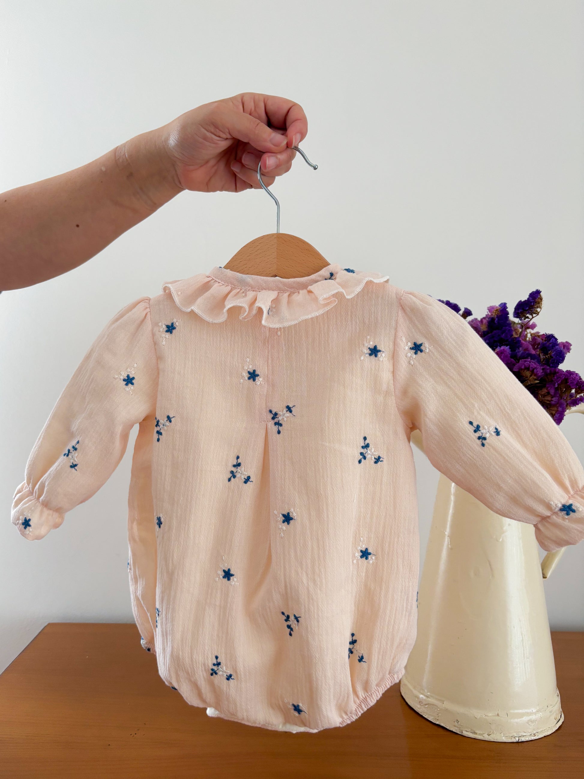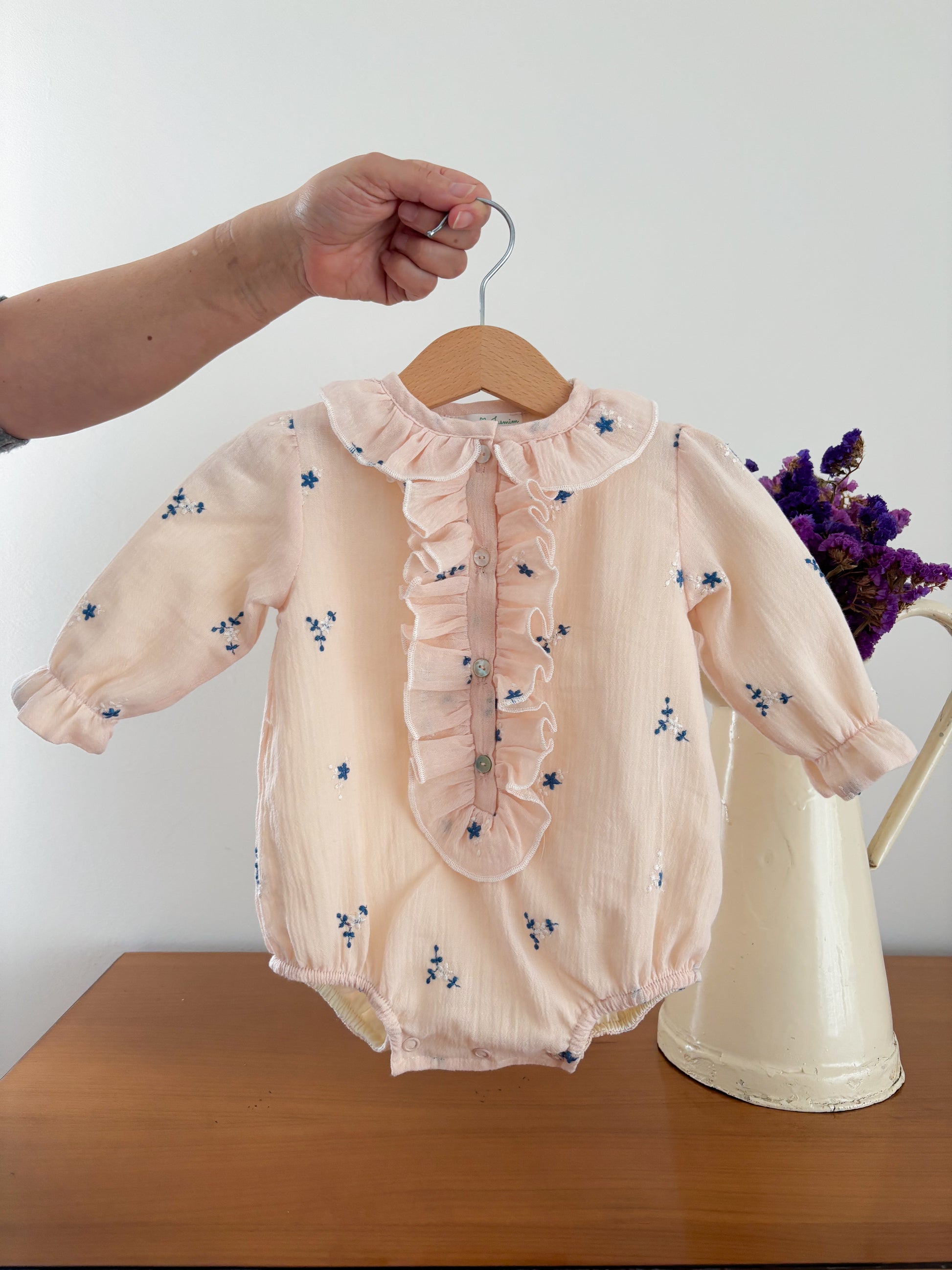 Fofo em tecido musselina com pormenor de flores bordadas e folho no peito e gola.