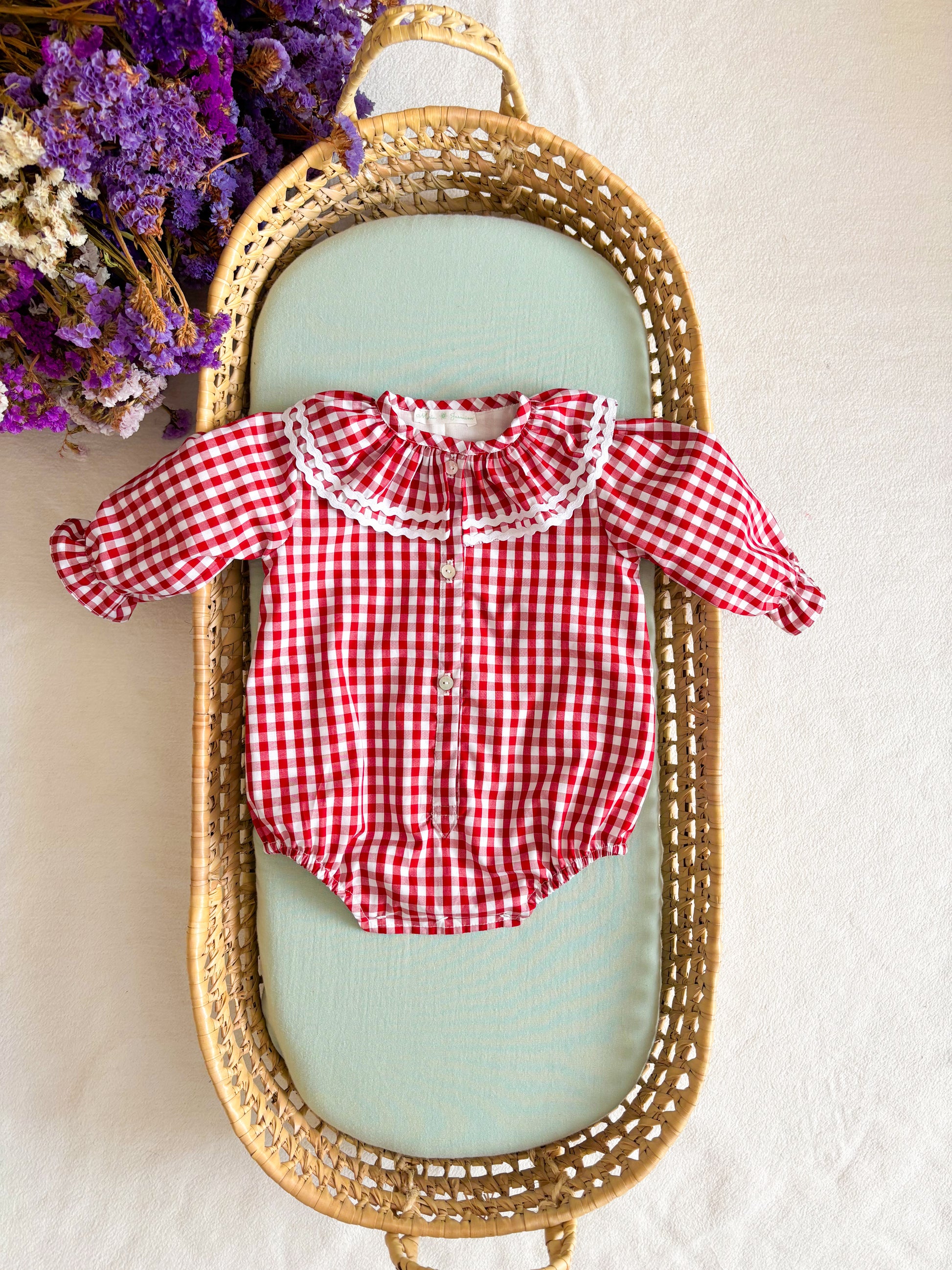 Fofo vichy vermelho com pormenor de gola volante com espiguilha branca.