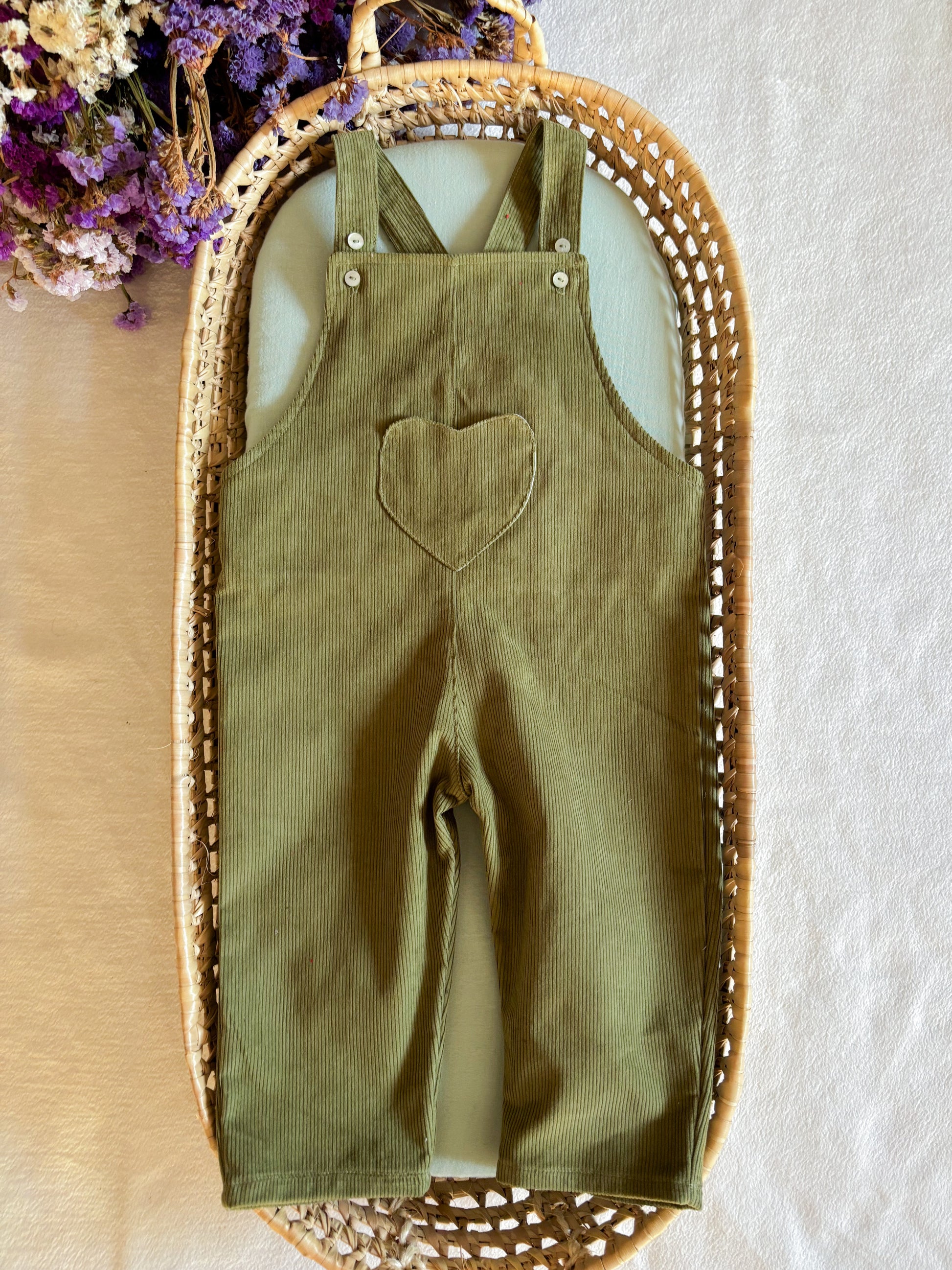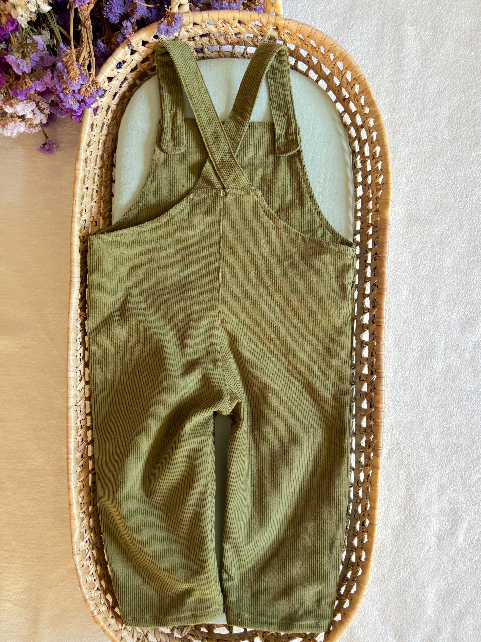 Jardineira em bombazina verde, com pormenor de bolso coração e 2 botões em madrepérola em cada alça que permite ajustar à evolução da criança. Com molas no entre pernas até ao 18 meses.