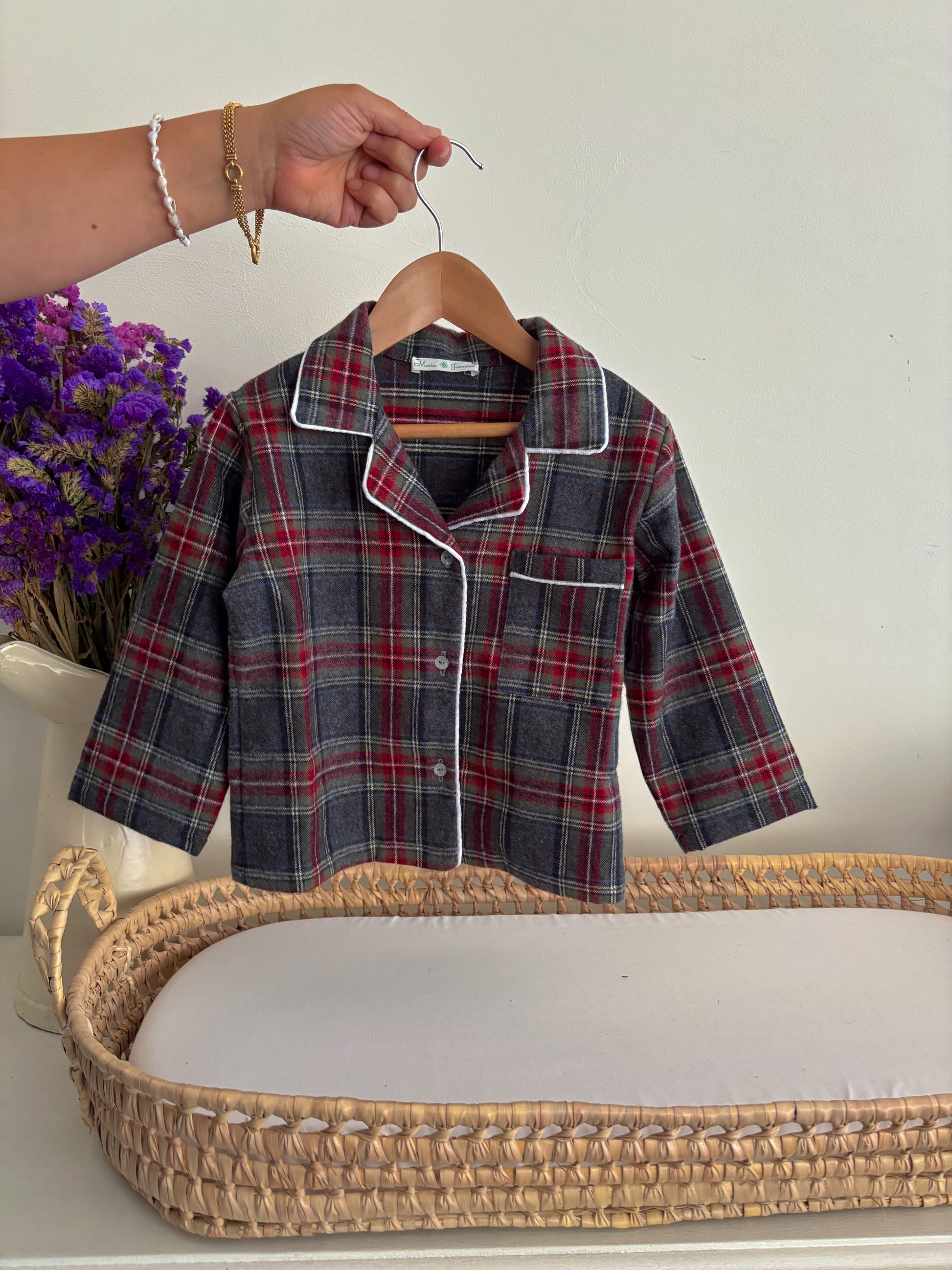 Pijama clássico em tecido xadrez vermelho e cinza, composto por camisa e calça.