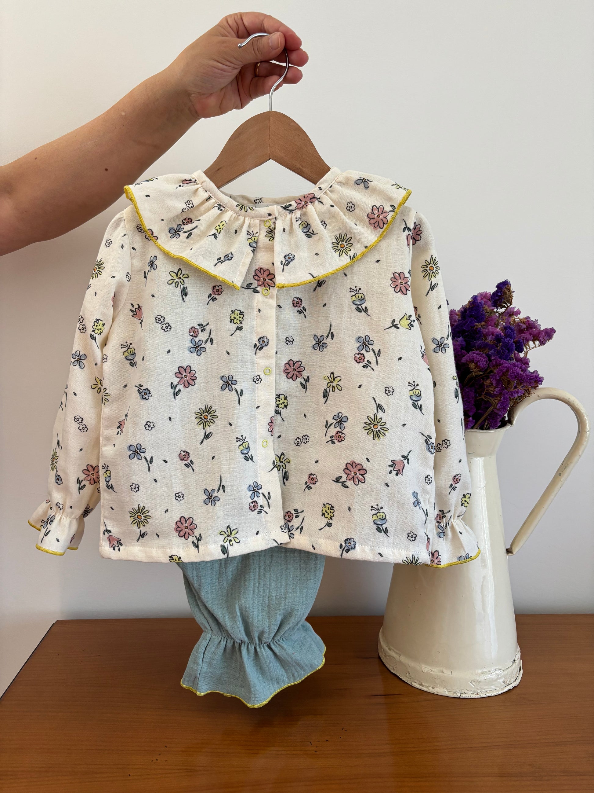 Pijama composto por calça musselina verde água e blusa musselina florida com gola volante.