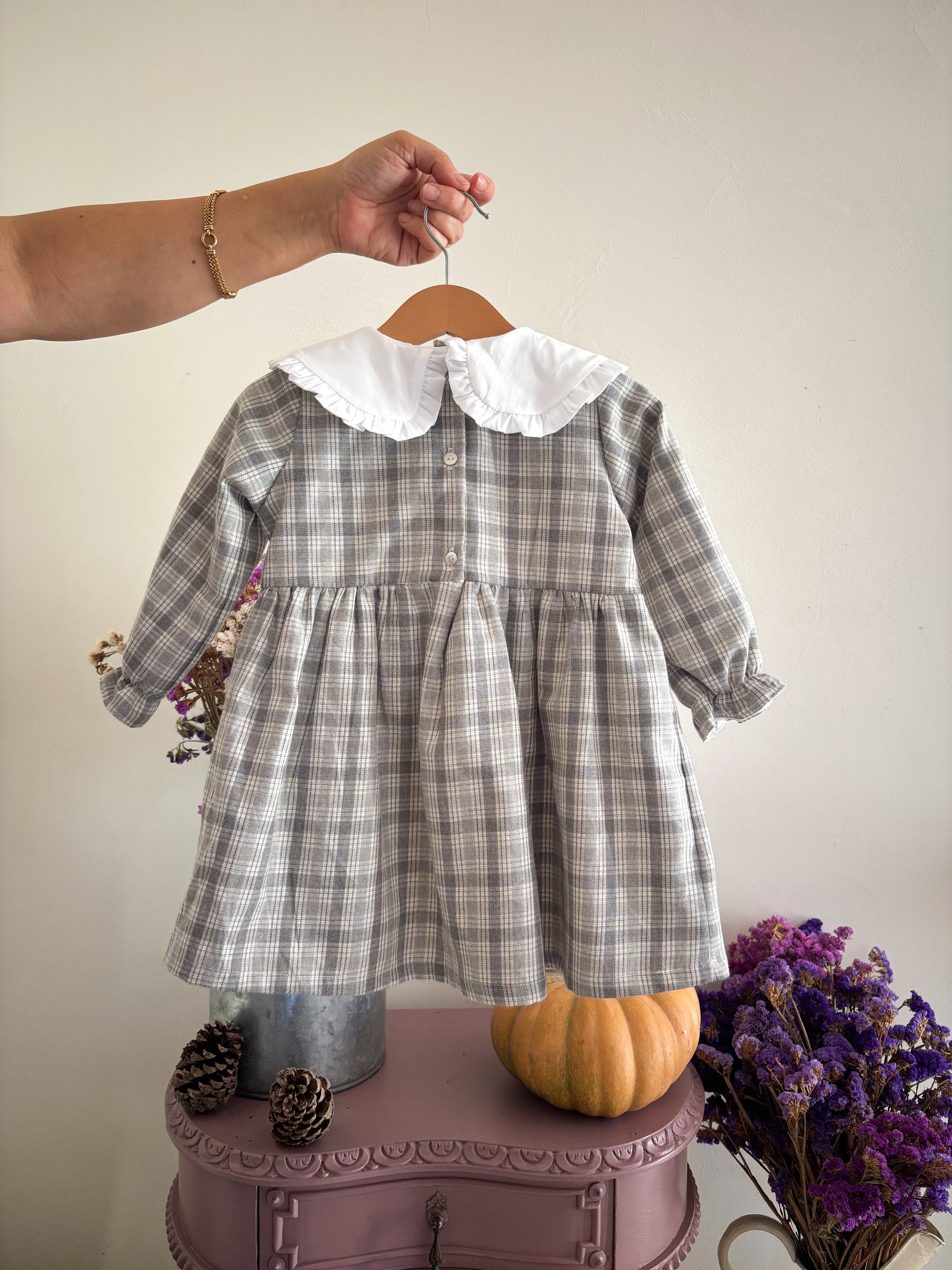 Vestido em tecido xadrez cinza com pormenor de gola boneca branca.